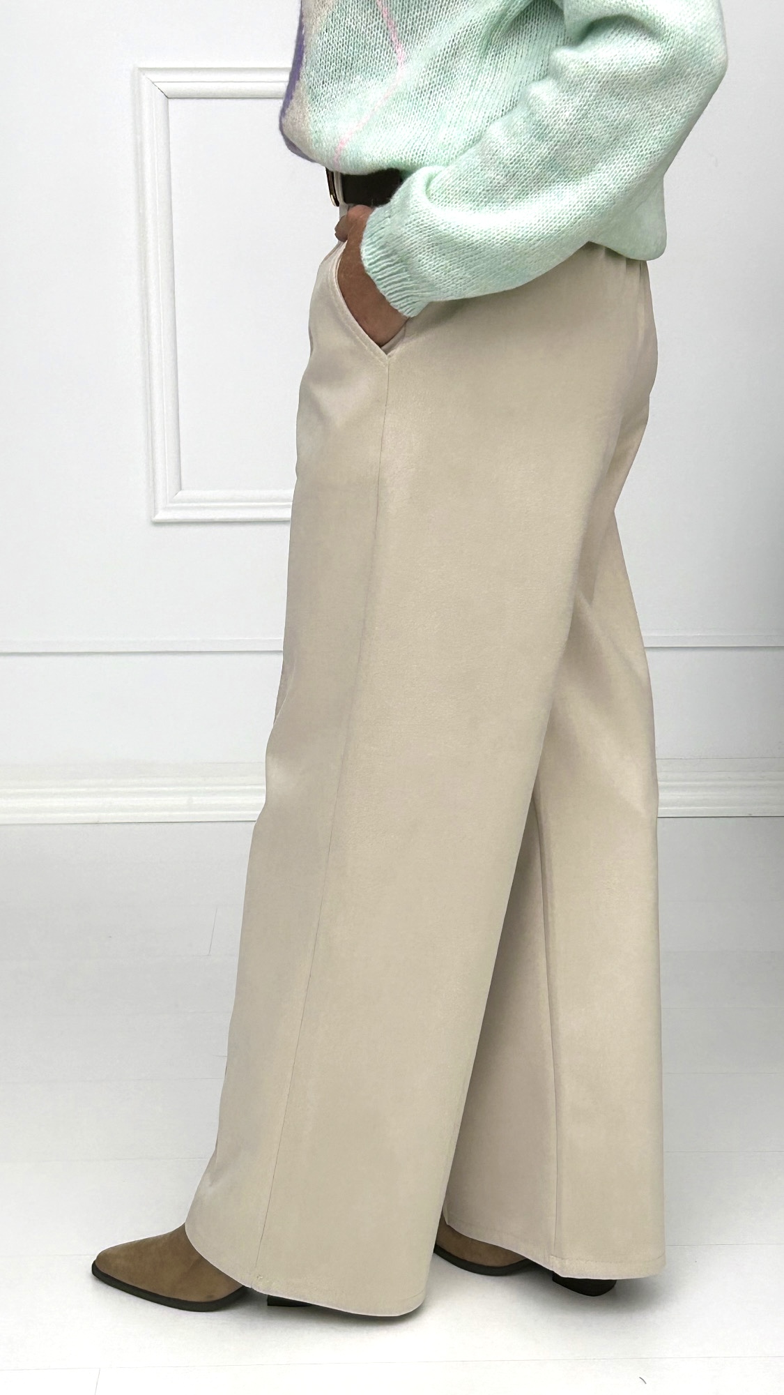 Pantalón ancho de corte recto con costura en la parte delantera de la pierna efecto pinza. Tejido de antelina, muy suave al tacto y elegante. Tiene bolsillos laterales y goma en la parte trasera de la cintura para adaptarse a tu cuerpo. Incluye cinturón marrón con hebilla cuadrada en dorado.
