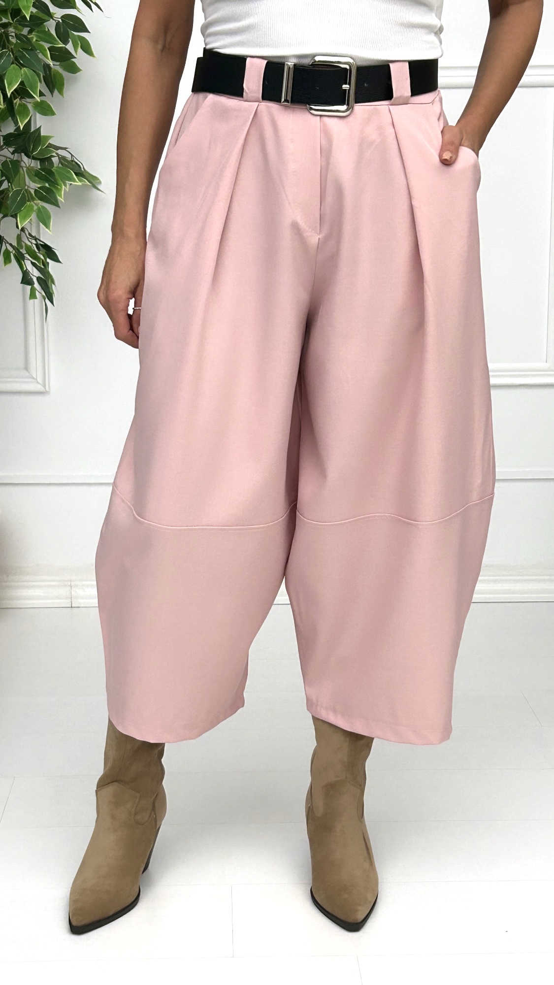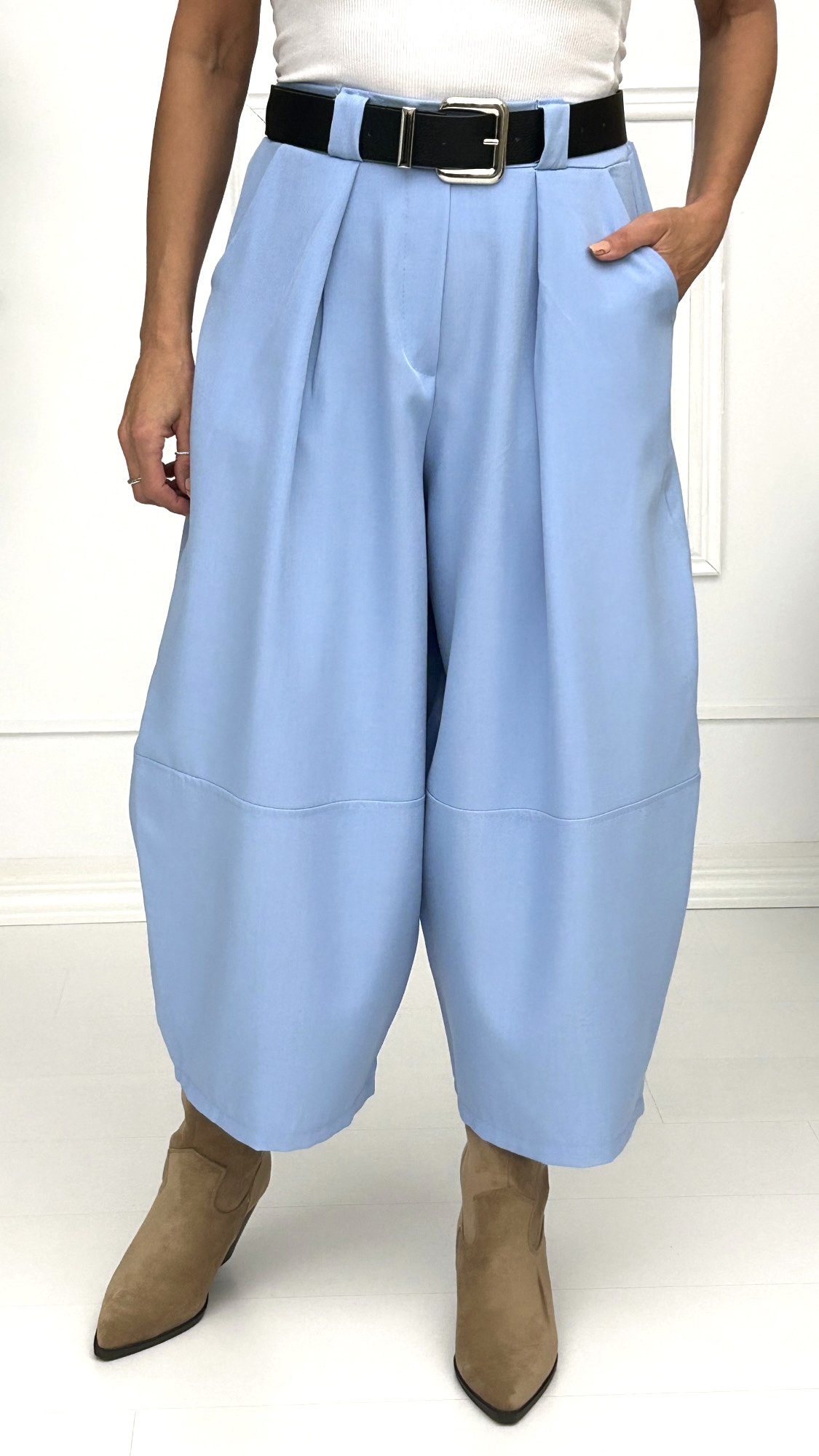 Pantalón ancho de largo tobillero y tiro alto. Sigue la tendencia del corte balón, ancho en cadera y piernas para terminar estrechándose en el bajo. Tiene goma en la cintura en la parte trasera. Pinzas en la parte delantera con falsa cremallera. Lleva bolsillos laterales e incluye cinturón ancho negro con hebilla cuadrada en plateado.
