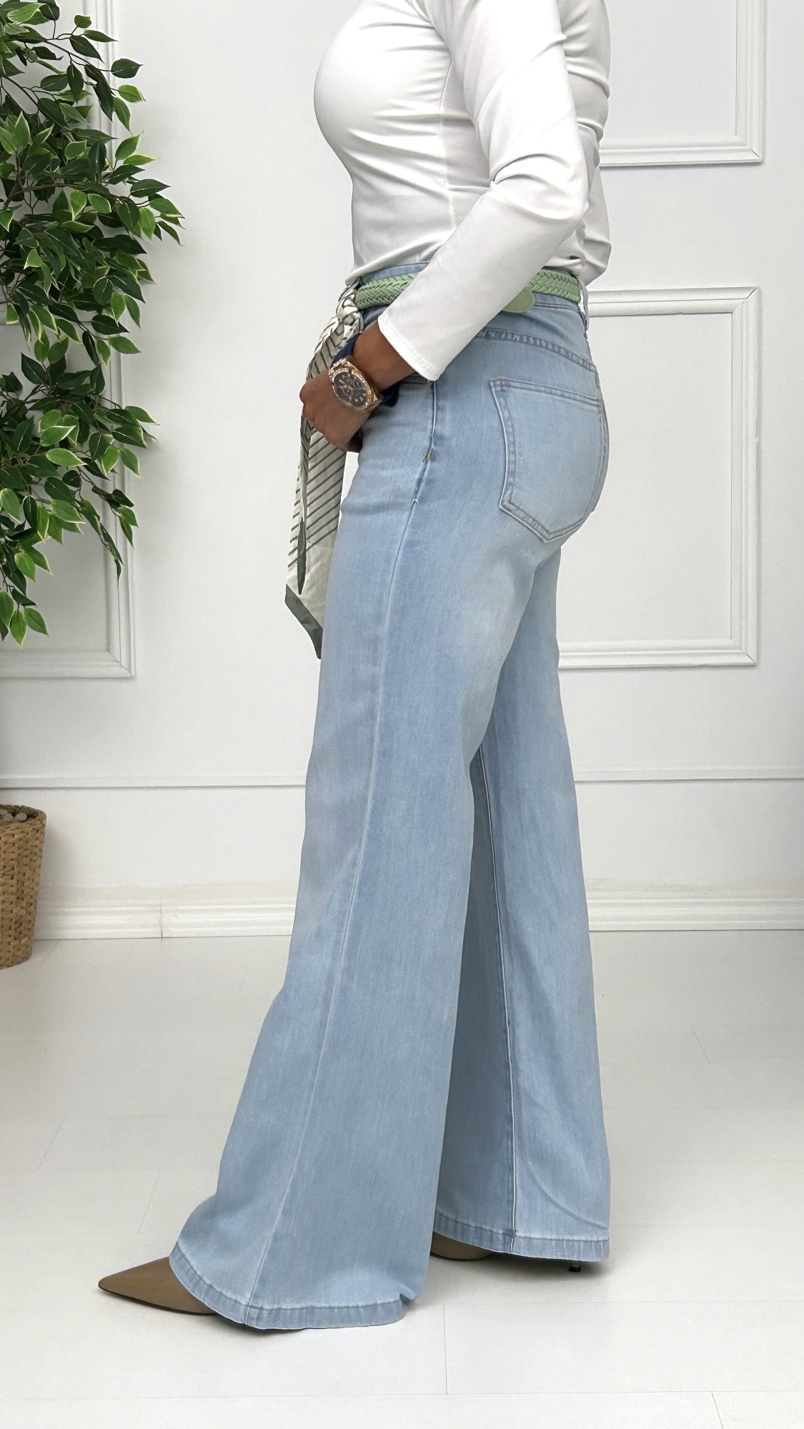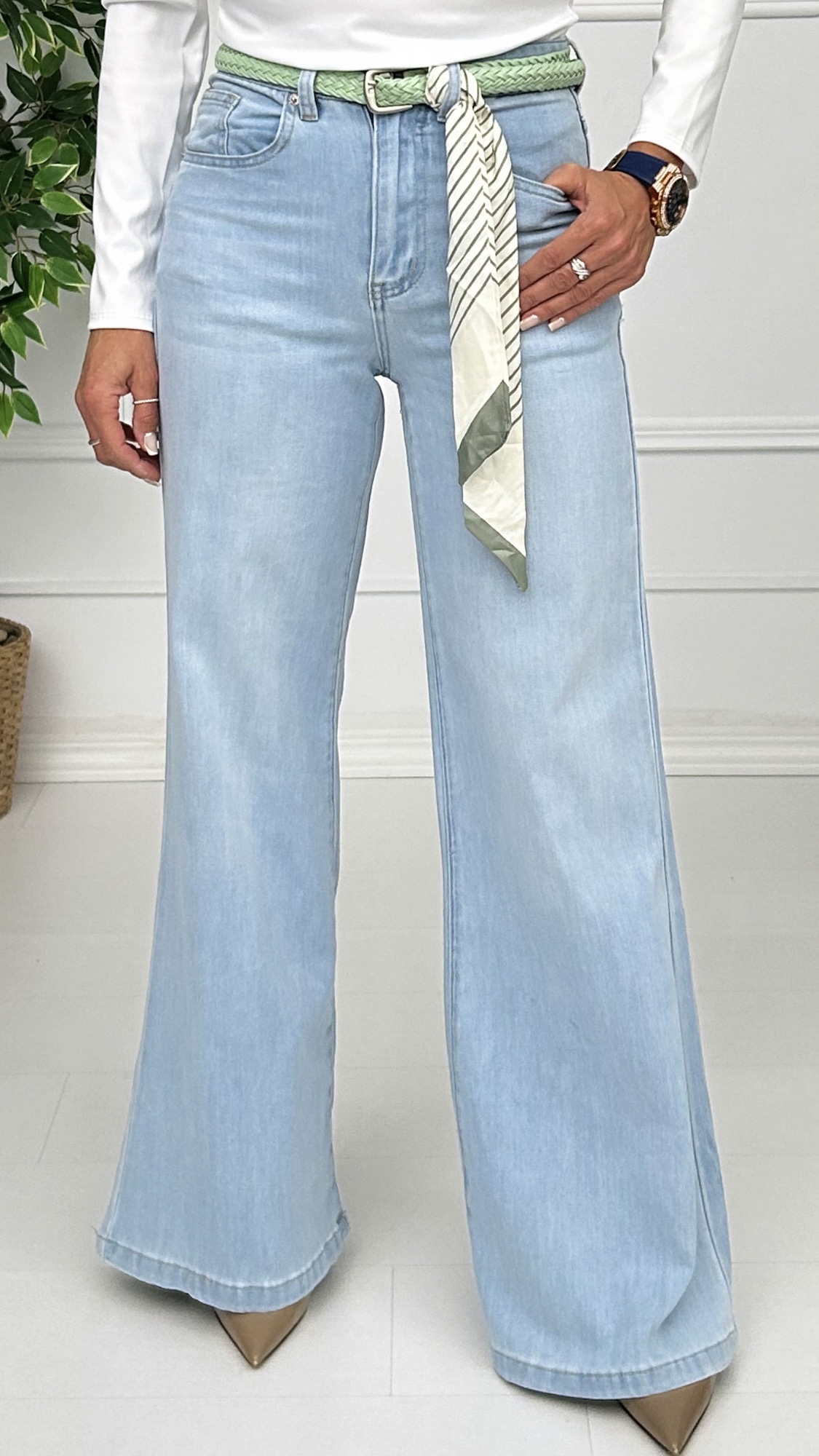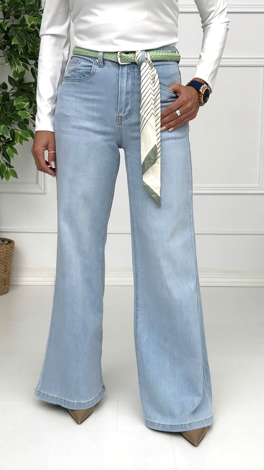 Pantalón de pierna ancha y corte recto con tiro medio alto. Ideal para la nueva temporada de primavera por su color blanco roto, súper elegante. Tiene un 1% de elastán y bolsillos cuadrados en la parte trasera que sientan bien a todo el mundo. Incluye cinturón trenzado en verde unido a un pañuelo que puedes poner o quitar según tu gusto.