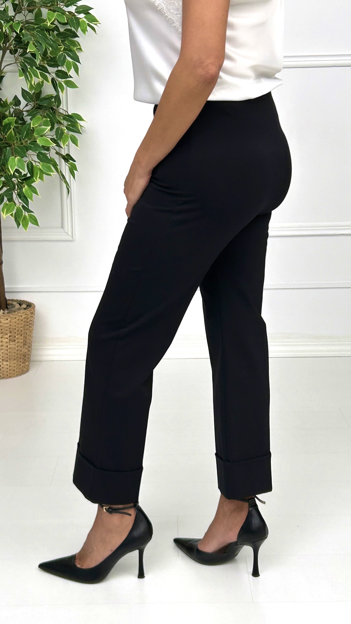 Pantalón disponible en dos colores básicos para tu fondo de armario. De largo tobillero con bajo ancho. Pegaditos en la cadera y ensanchando para bajar en corte recto. Con goma en la cintura y elástico. Se adaptan a tu figura y realzan tu silueta.