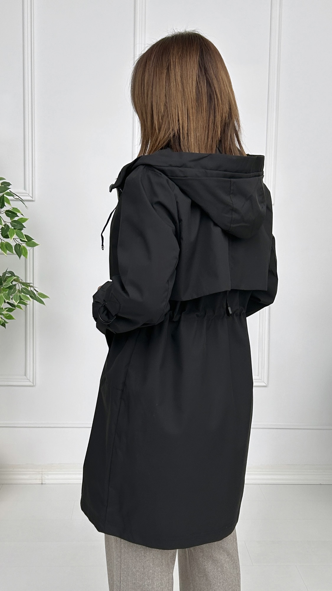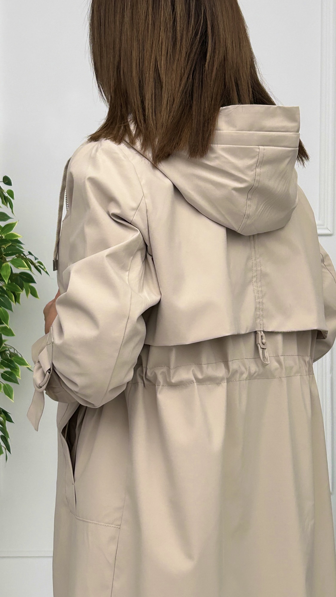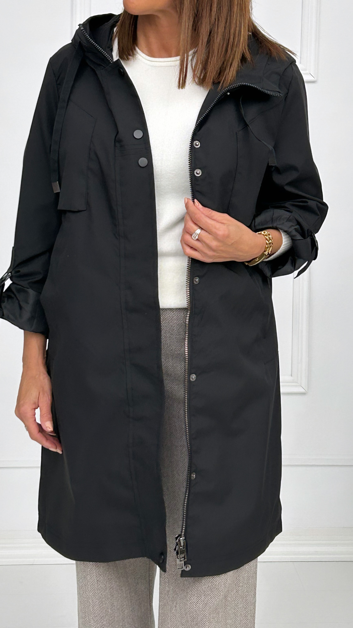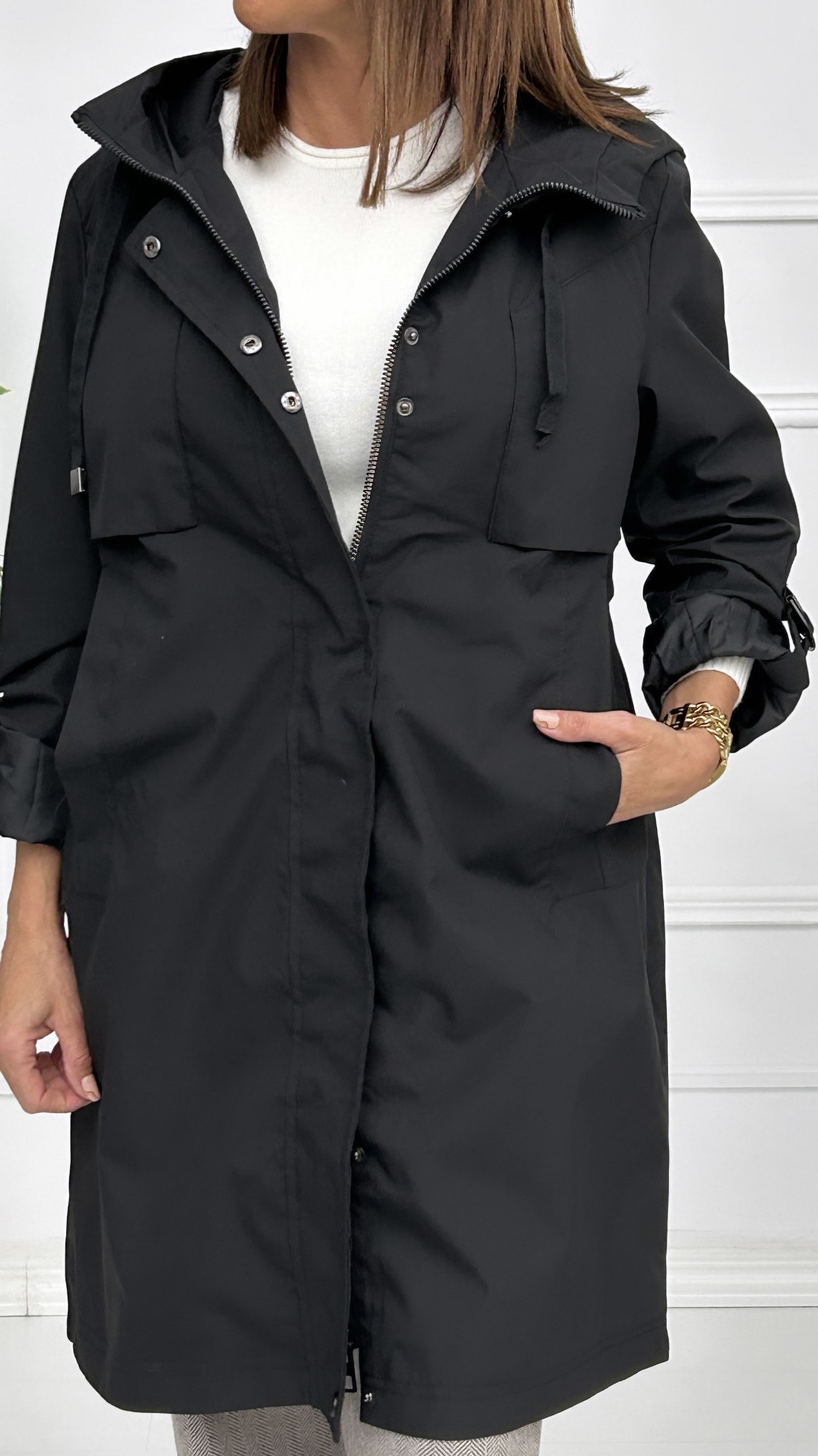 Disponible en colores básicos. Con forro interior, bolsillos laterales y gorro unido a la prenda con cordón para ajustar. Tiene goma en la cintura para entallar y ajustar a tu cuerpo. Canesú desde la parte delantera hasta la espalda con cordón para fruncir y aretes en el brazo con tira para acortar la manga y llevarla sujeta. Cierre de cremallera oculta con solapa por encima y botones de presión en el mismo color de la prenda.