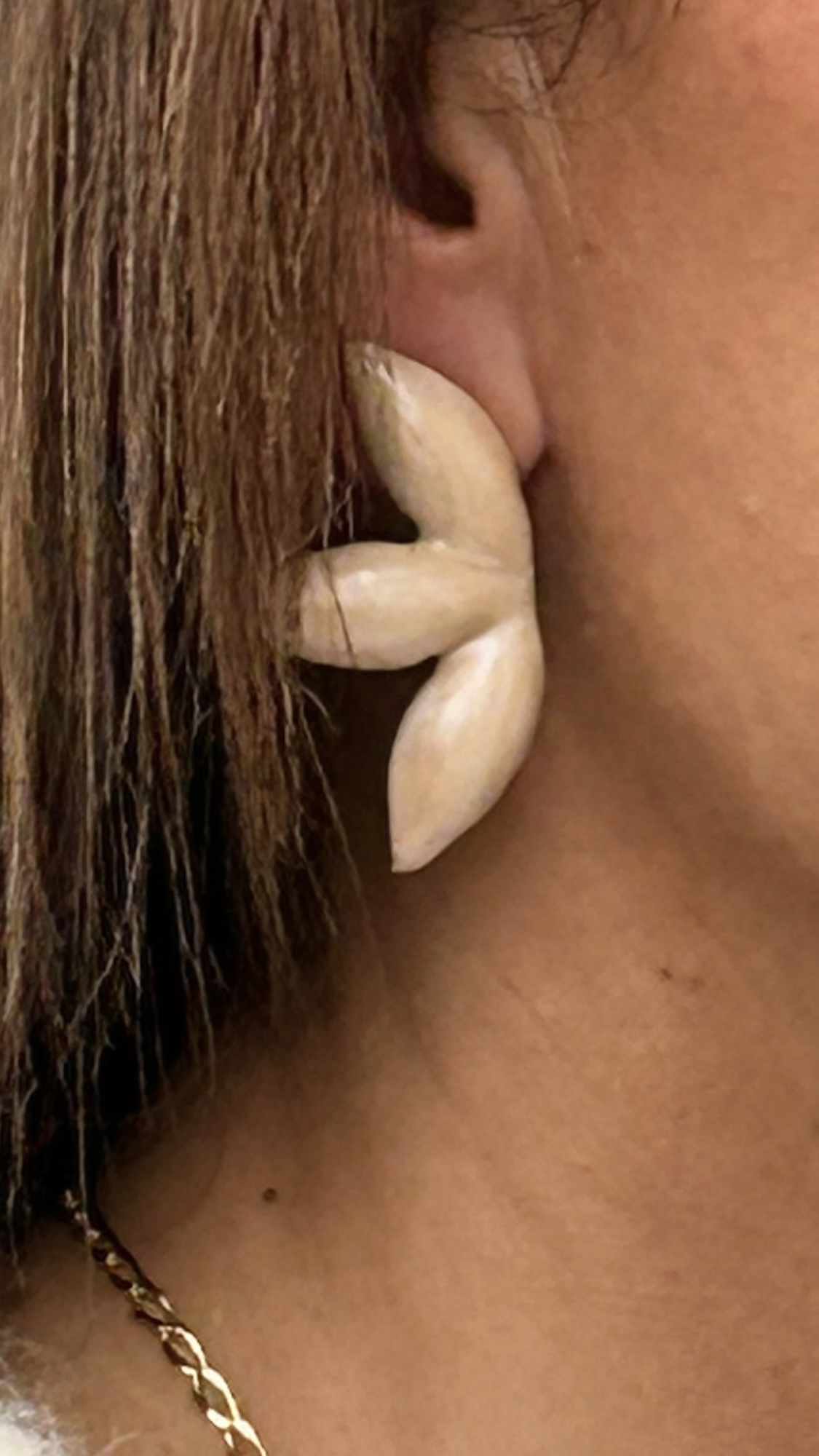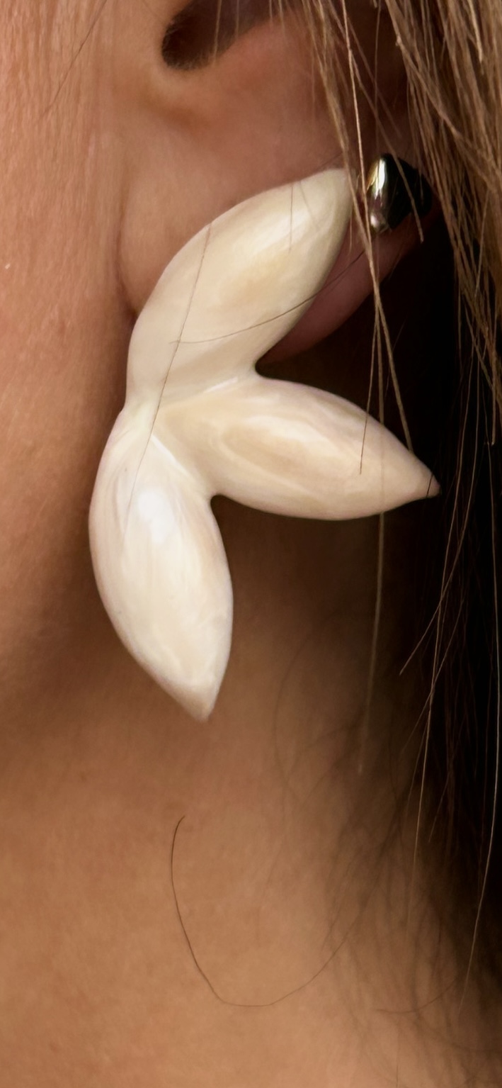 Pendientes de color nacarado, con brillo. Una especie de hoja triple con dorado por la parte de detrás. Cierre clásico de tuerca. No pesan nada.