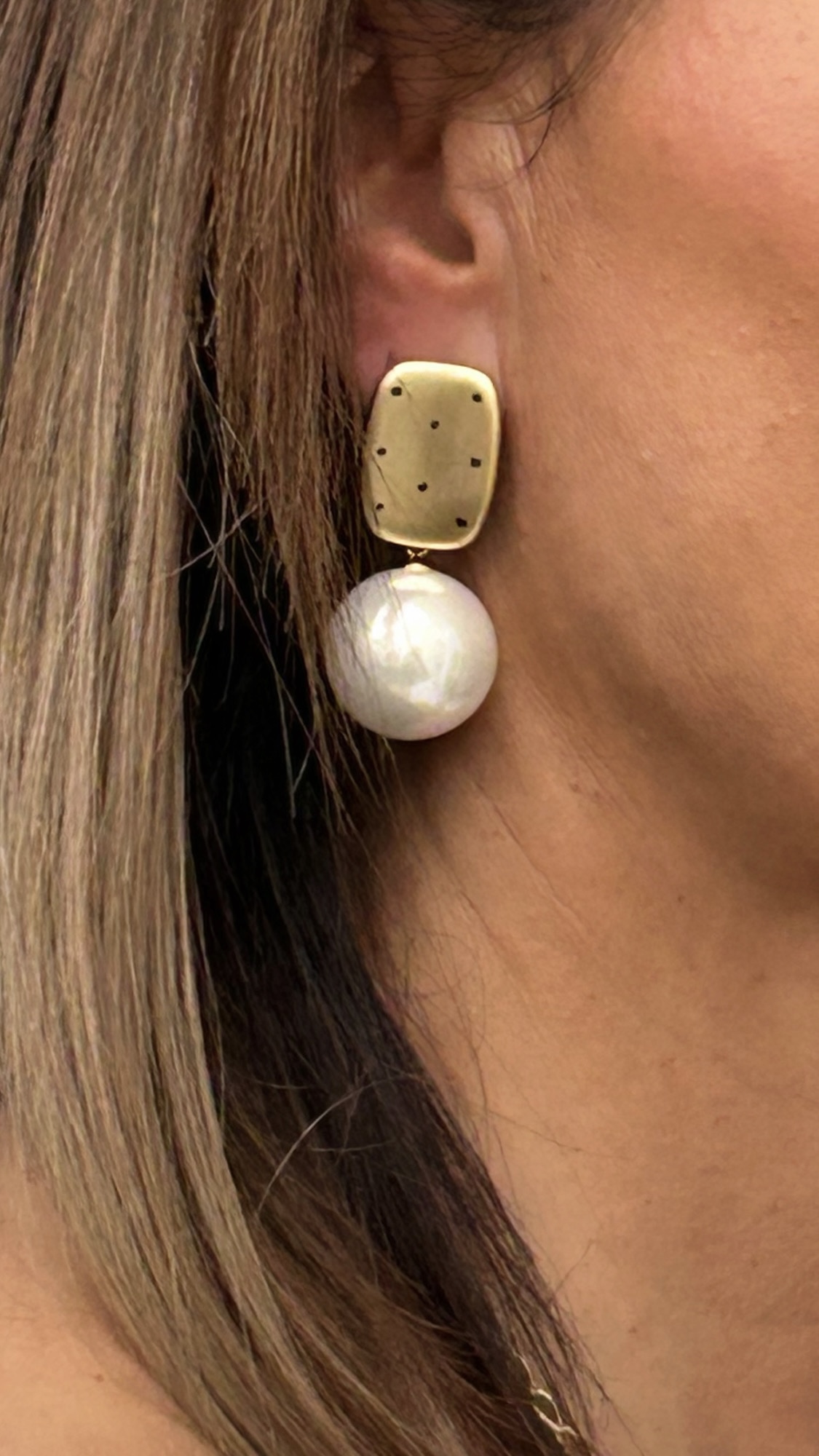 Pendientes en material de aleación con acrílico. Una perla en blanco roto unido a un rectángulo dorado con puntitos negros muy sutiles. Un pendiente con perla original que siempre aporta elegancia a tu look.