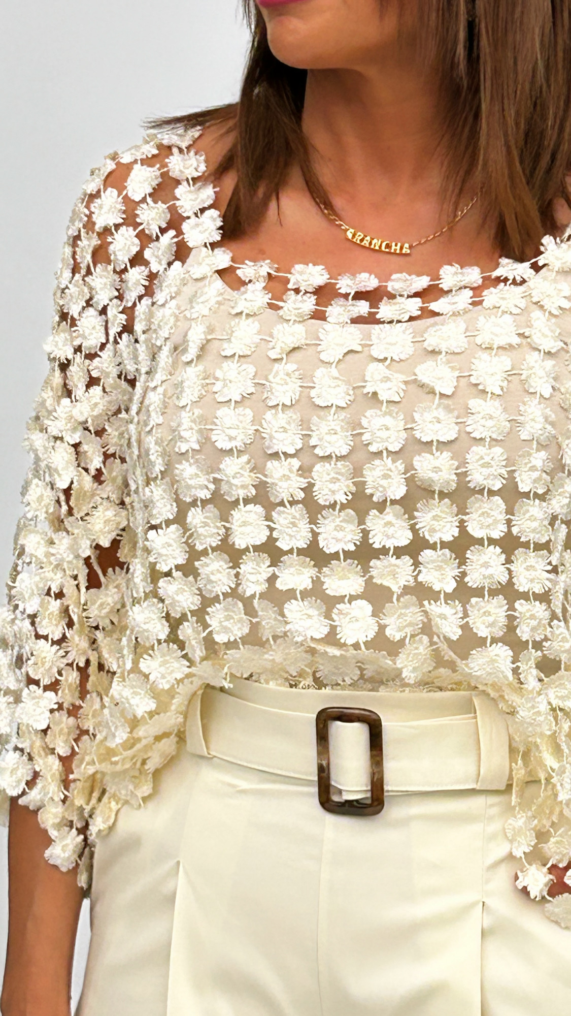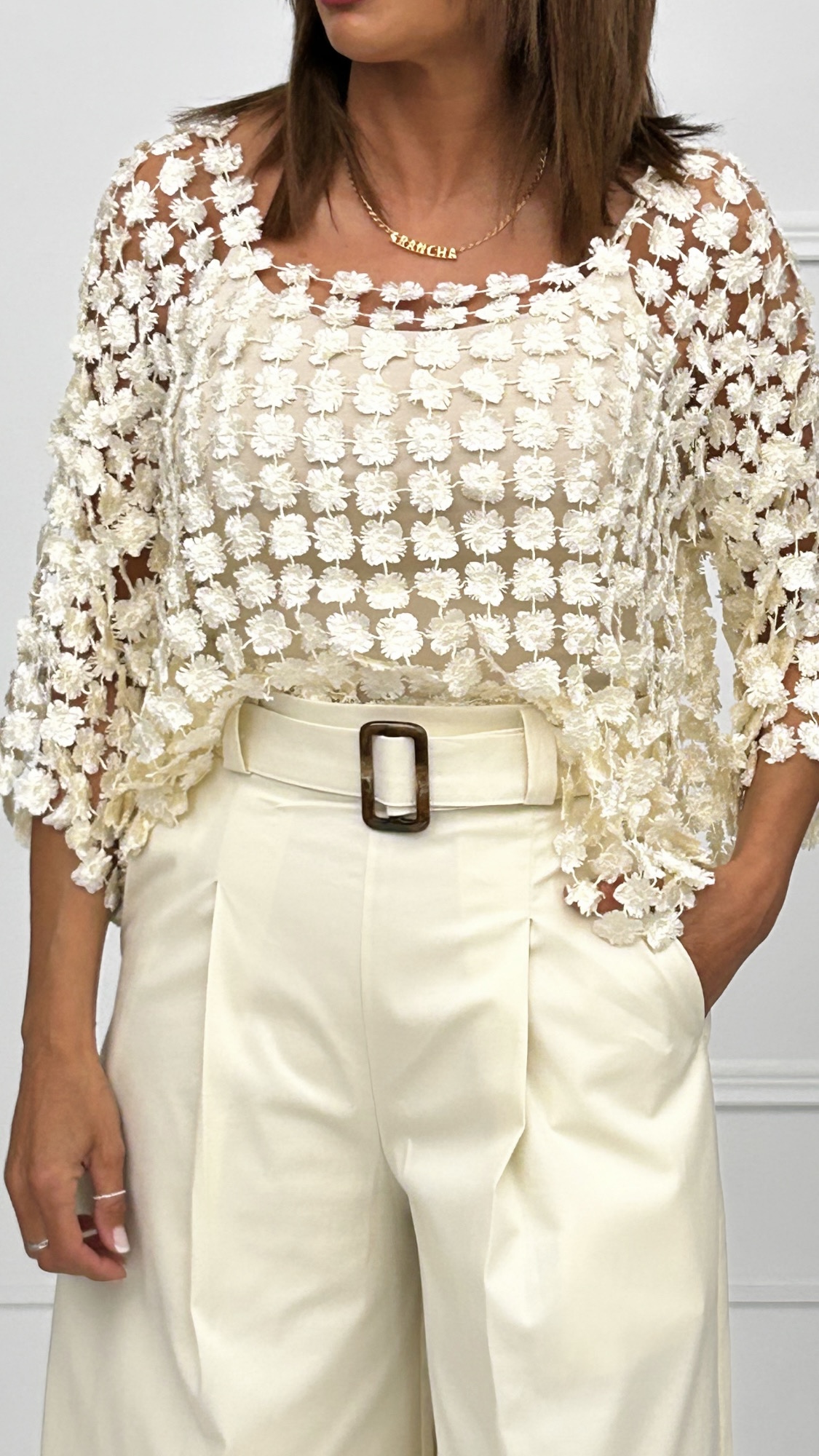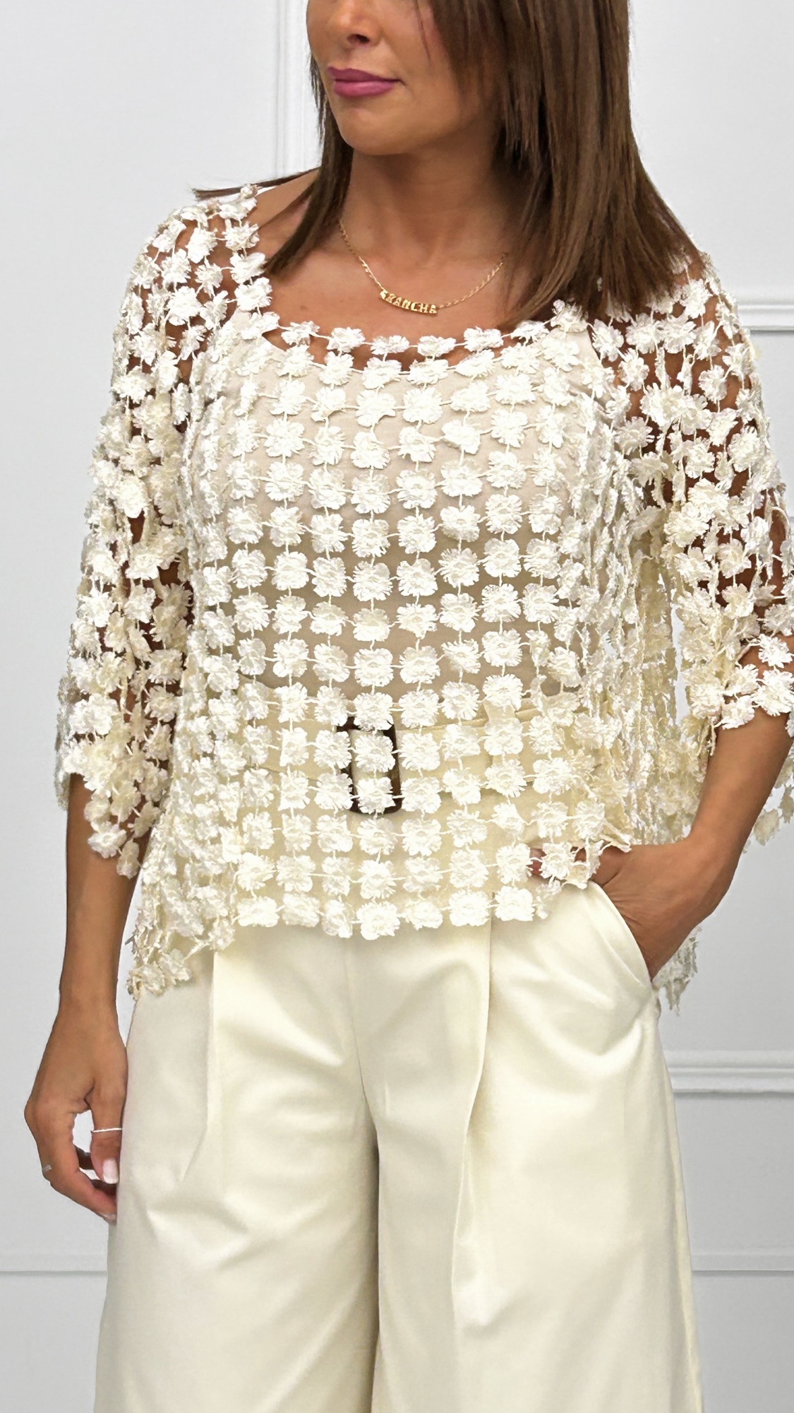 Preciosa blusa calada tipo poncho de manga tres cuartos ancha, fabricado en hilos diseñados en formas de flor que nosotras hemos decidido llamar margaritas porque nos recuerda al comienzo de la primavera. Una prenda que necesitaras en tu armario ya que puedes ponerlo tanto para ir súper elegante a un evento como ponerlo un poco mas de sport con unos vaqueros y unas deportivas.