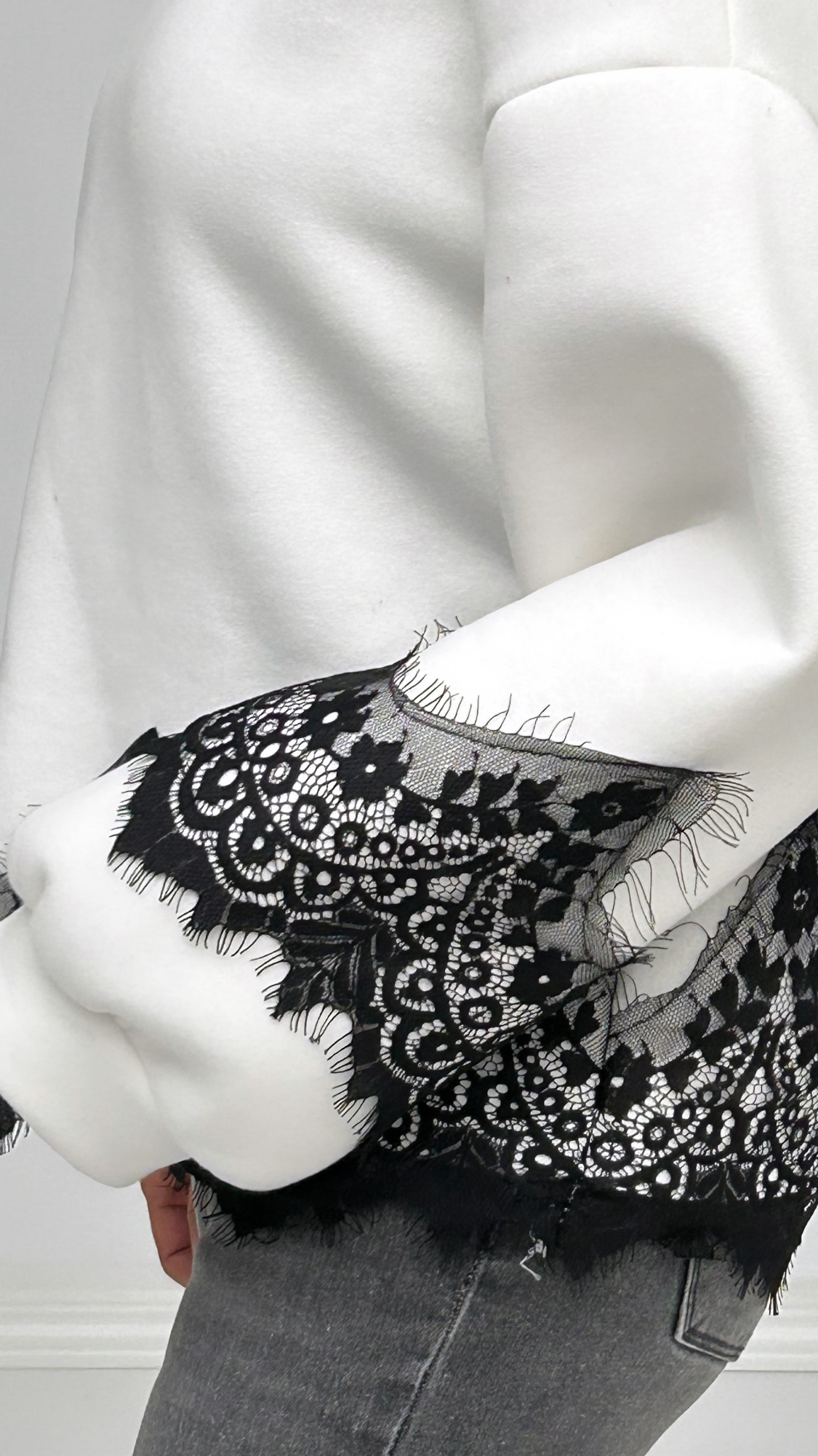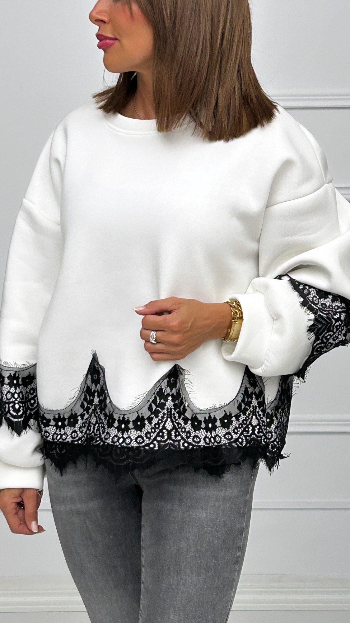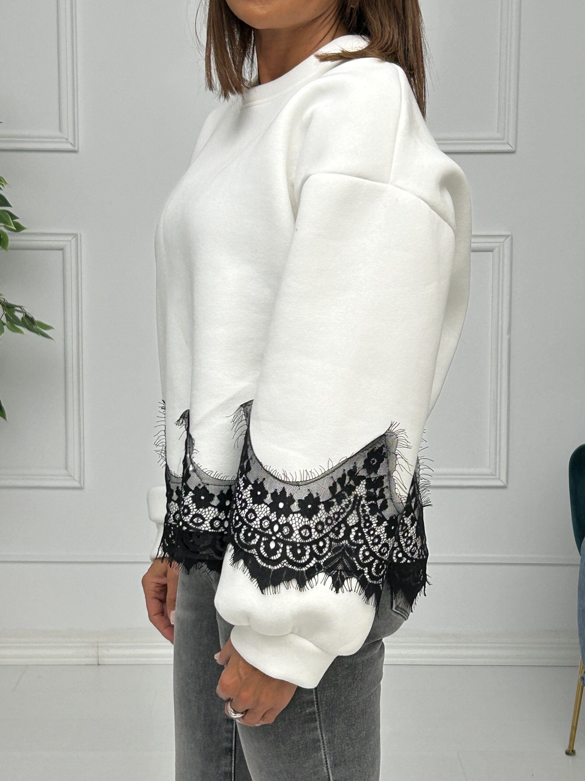 Sudadera de algodón forrada por dentro, muy calentita. De manga larga y cuello redondo. Disponible en varios colores, con encaje en la manga en color oscuro haciendo contraste con el color de base. Bajo recto también con encaje, un detalle de tendencia y que le da el toque especial a la prenda.