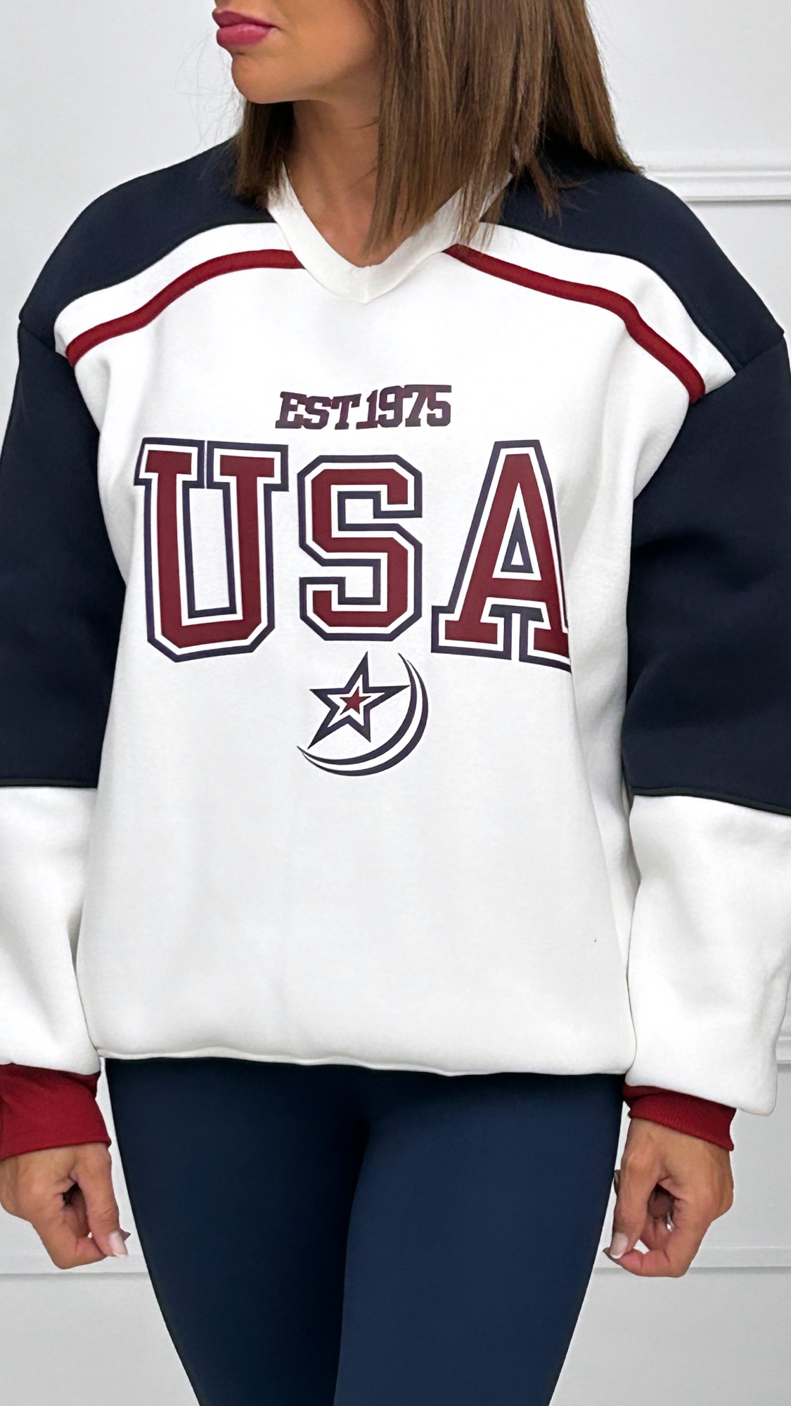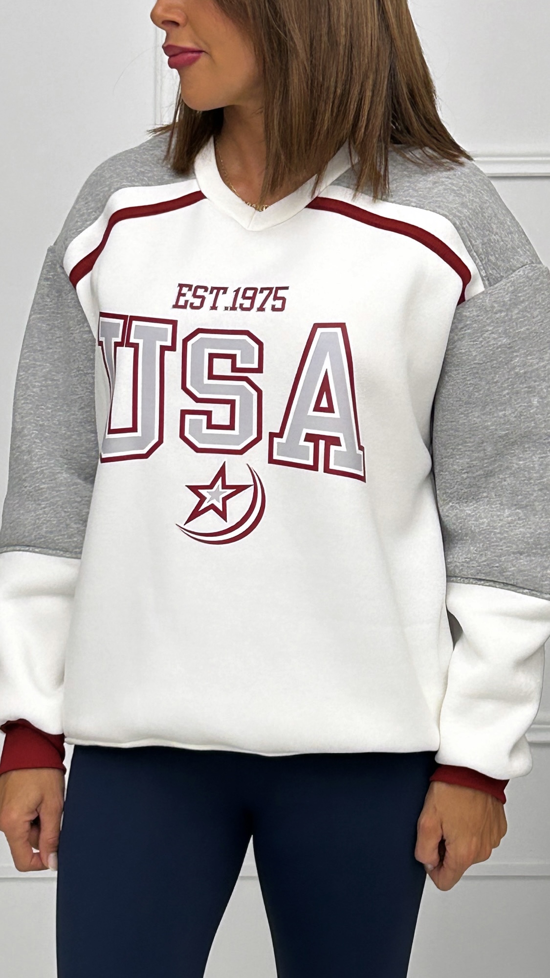 Sudadera estilo oversize bicolor, la manga larga va en un tono diferente al cuerpo de la sudadera donde podemos ver serigrafiado la palabra USA en tono burdeos. Cuello en pico perfecta para poner con camisa y darle un toque diferente a nuestro look.