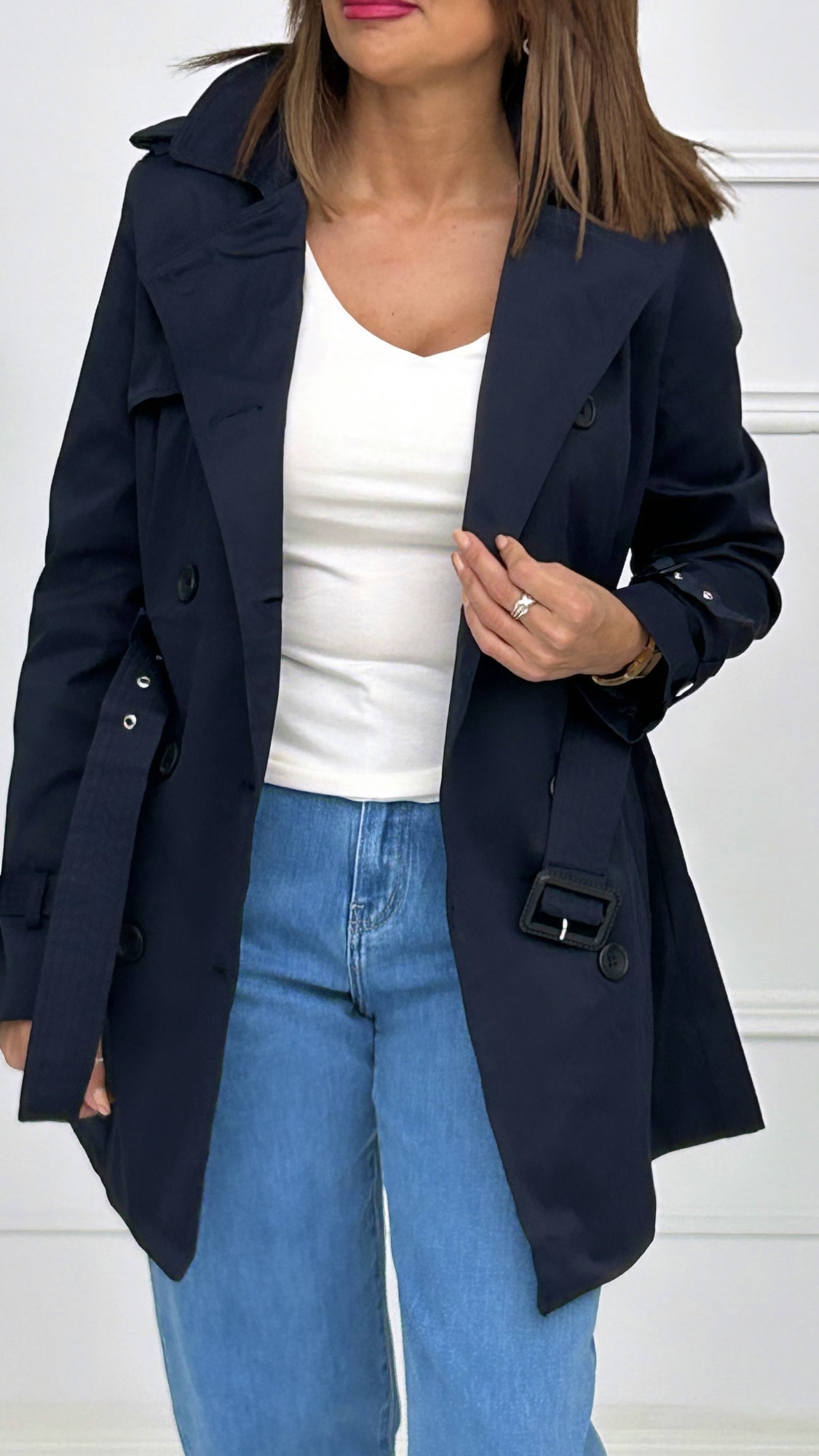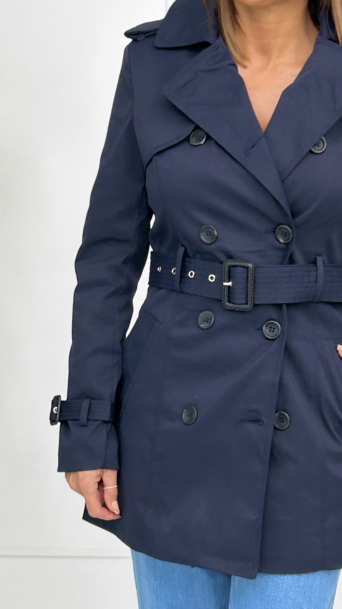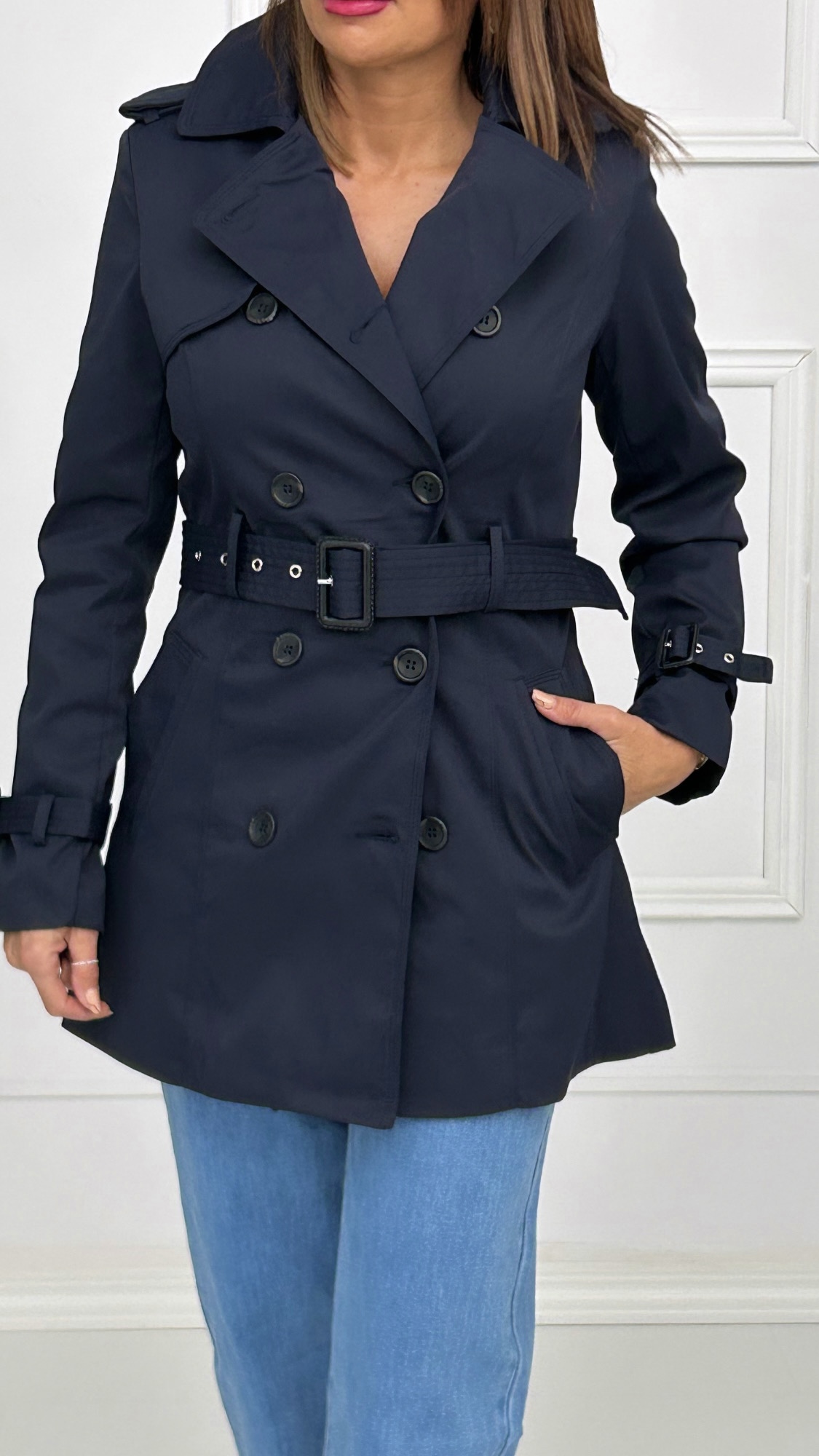 Trench clásica de corte midi con botones en tono marrón y cinturón de la misma tela y color. Disponible en dos colores.