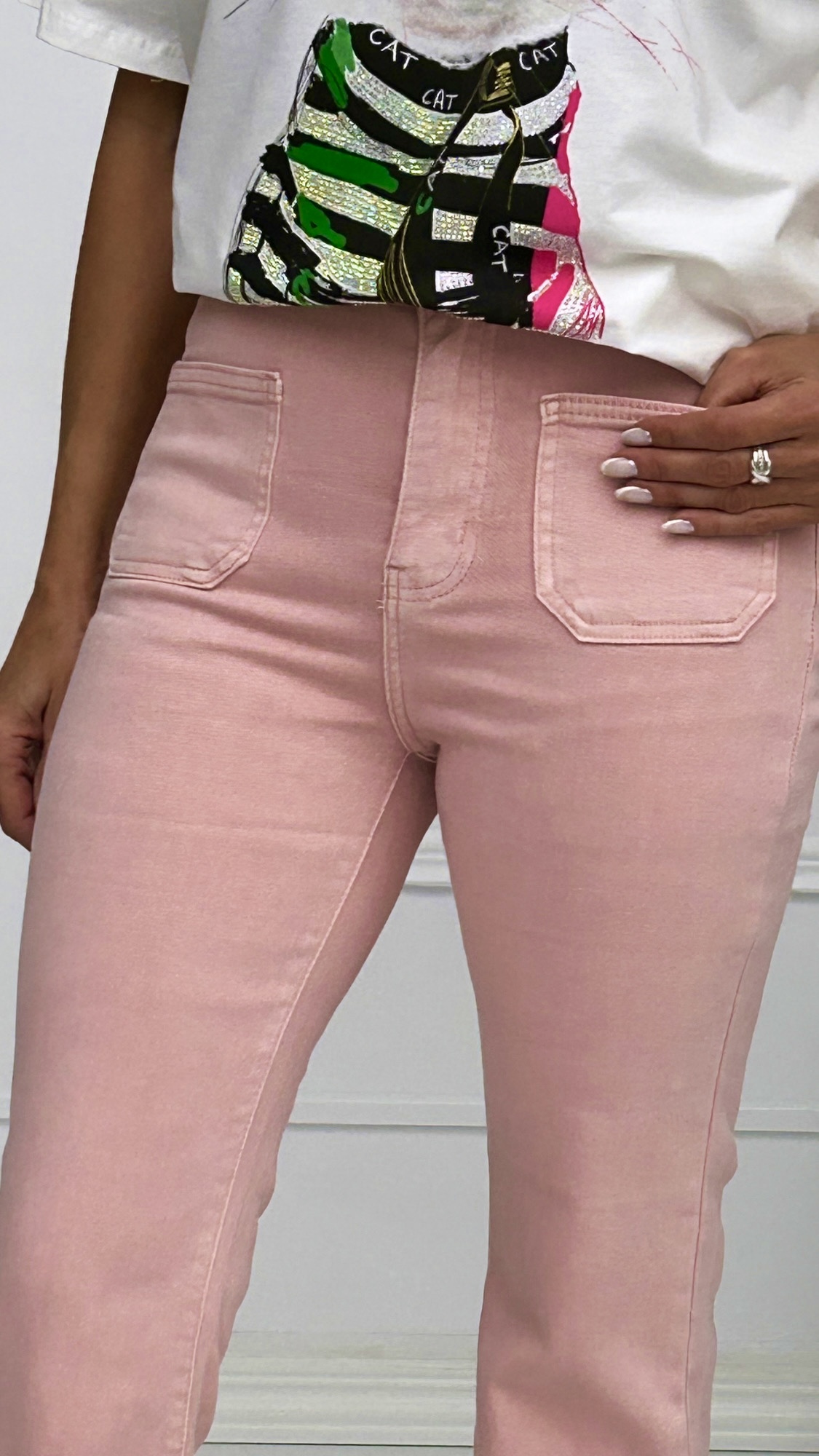 Llegan los colores primaverales en los vaqueros y este modelo nos encanta! Modelo Flare de pierna ajustada en cadera y muslo que comienza a ensancharse gradualmente desde la rodilla hacia abajo hasta llegar al tobillo con bajo desflecado. Bolsillo cuadrado en la parte delantera.