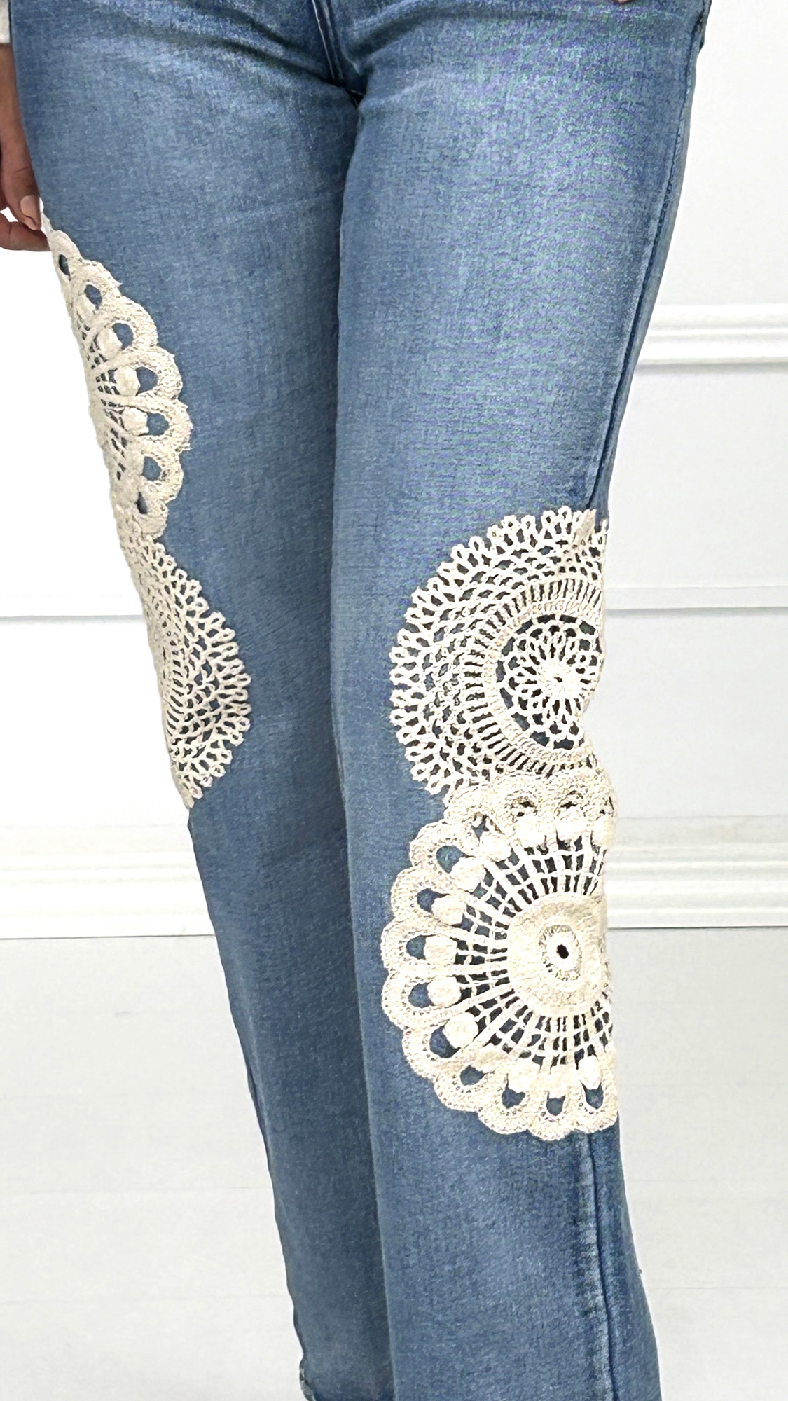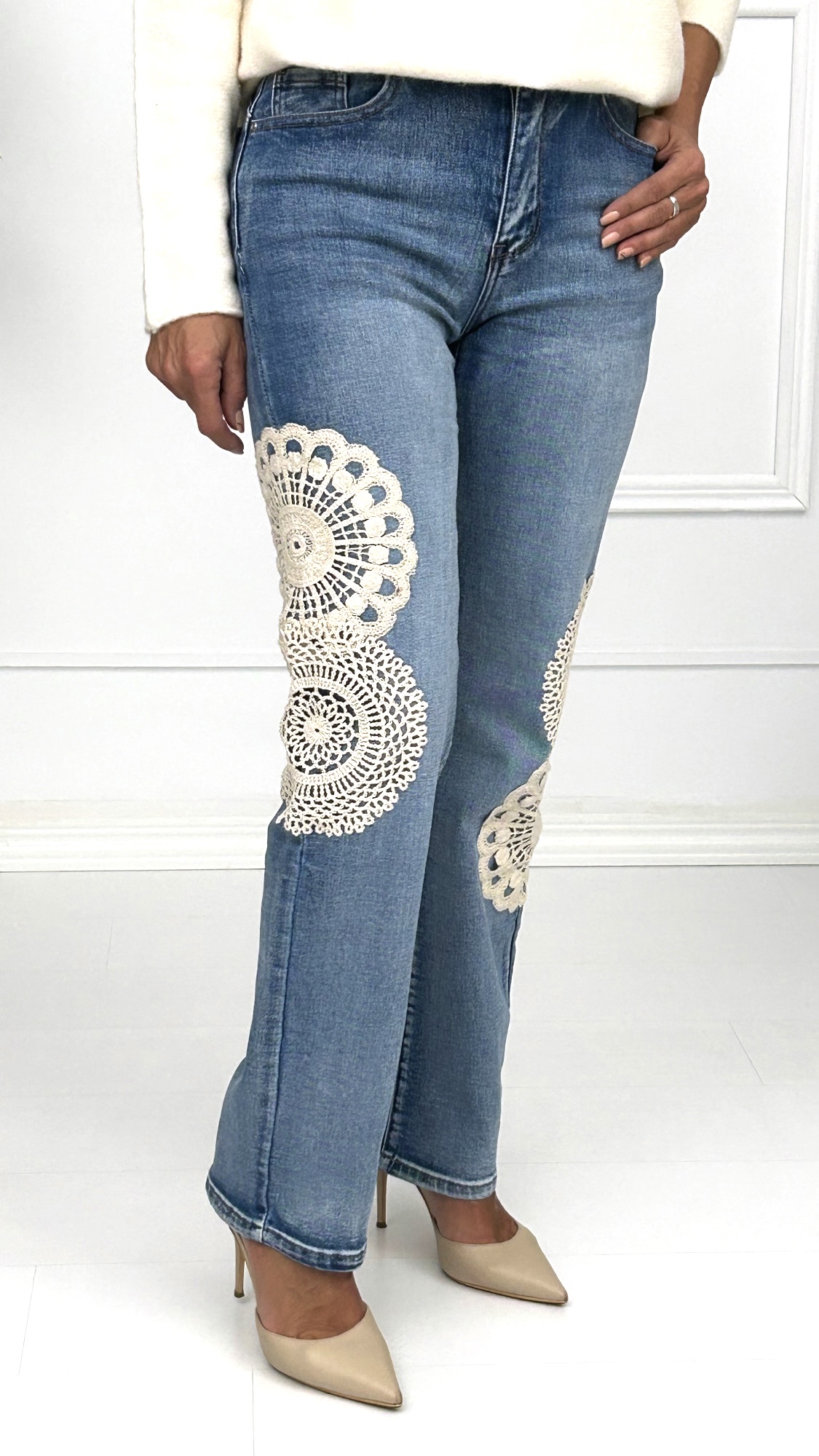 Pantalón vaquero estilo recto de tono azul lavado claro, una prenda clásica que nos enamorará por su diseño de dos rosetones en crochet beige que adornan el lateral de cada pierna. Una prenda clásica con ese toque original.