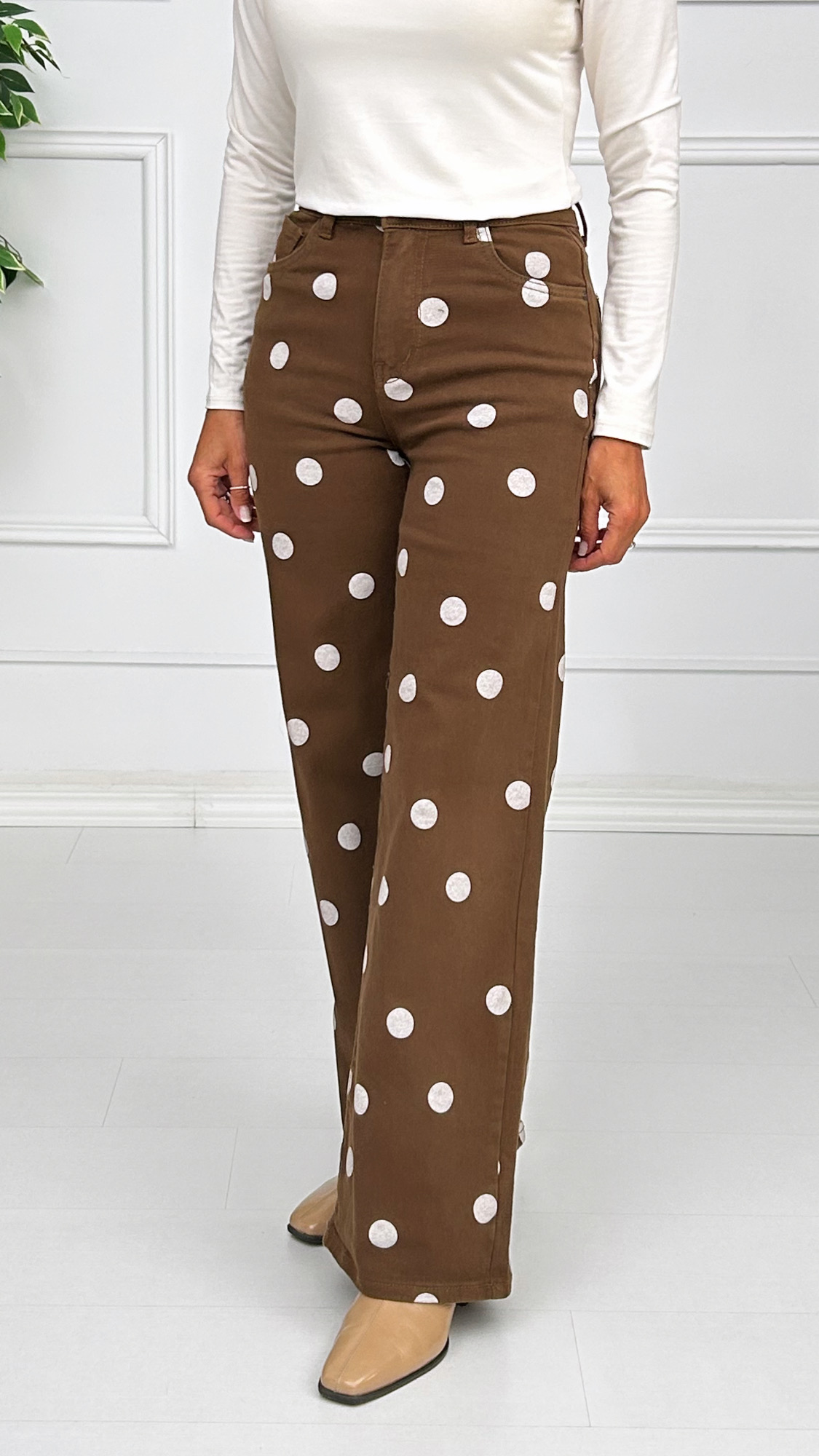 Vaquero de corte recto disponible en tallas desde la XS a la XL con un 3% de elastán que sigue la tendencia más actual al llevar el estampado de lunares por toda la prenda. Disponible en color marrón con los lunares en blanco.