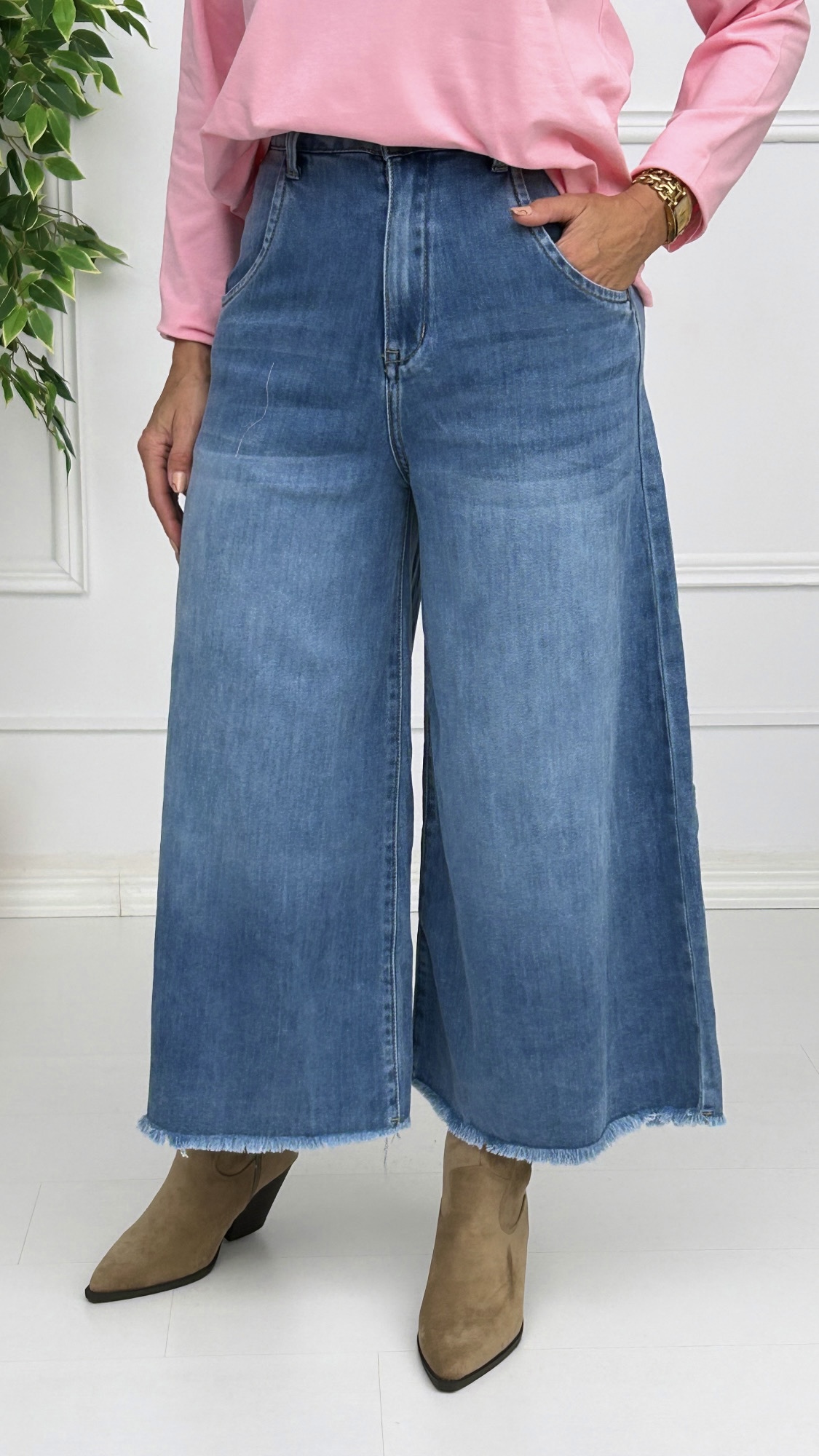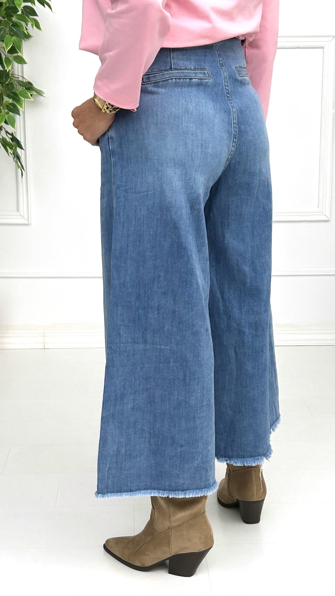 Vaquero de corte midi de estilo ancho y con la parte de abajo desflecada para darle ese toque cañero a nuestro look. Con bolsillos laterales estilo chino al igual que los de a parte de atrás. Perfectos para poner con botas o deportivas, unos pantalones súper versátiles.