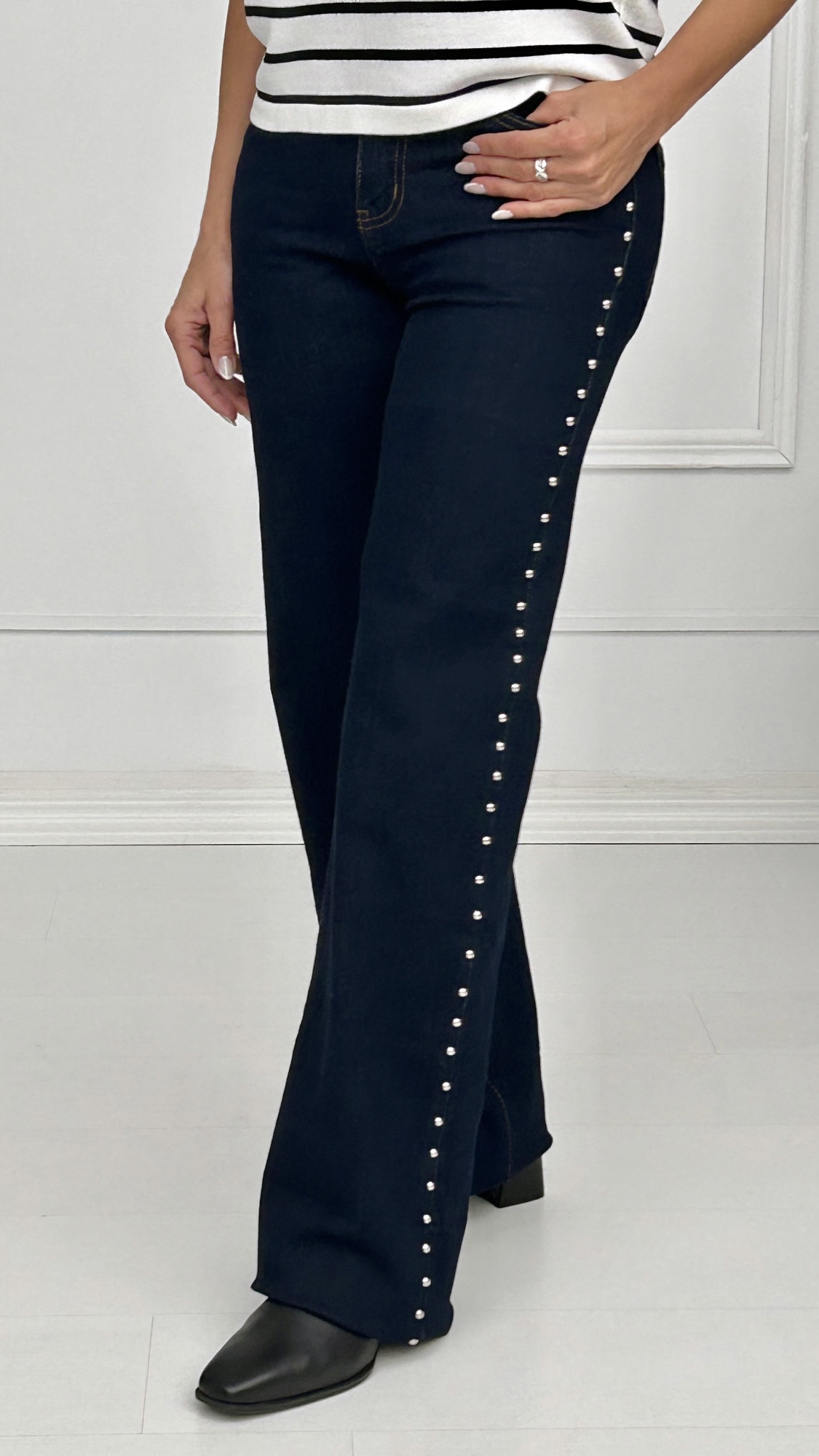 Pantalón vaquero de pierna ancha y corte recto. Lleva el bajo desflecado y una hilera de tachuelas en plata en el lateral exterior de la pernera. Disponible en marino, un color que nos encanta para llevar en primavera combinado con colores más cálidos o tonos pastel en la parte superior. 2% de elastán.