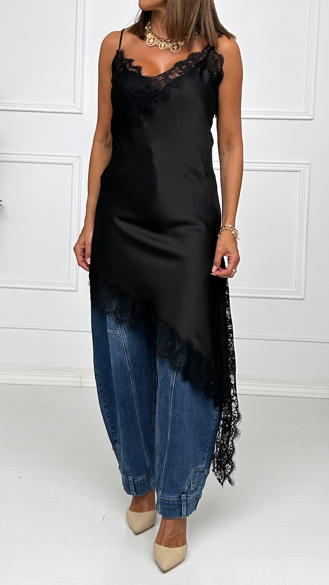 Vestido lencero con corte asimétrico, tirante de cola de ratón y abertura lateral. Una prenda súper de moda que no puede faltar en tu armario. Disponible en varios colores con la puntilla del mismo color para darle ese toque elegante gracias a sus transparencias en la zona que cae por el torso.