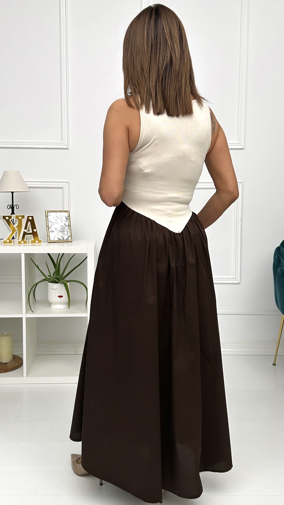 Vestido largo mitad tela de canalé en la parte superior para ajustarse perfectamente a nuestra figura, de tirante y escote en pico, y mitad tela de popelín fruncida para crear pliegues dándole un toque fresquito a esta preciosidad de prenda. Con forma en V en la zona de la barriga creando un efecto que queda precioso.
